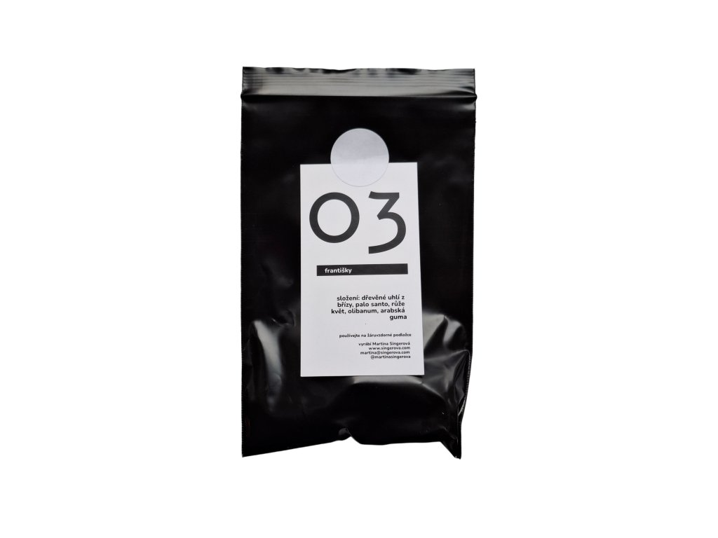 Originální kolekce františků propojuje tradiční ingredience, například kadidlo, s méně obvyklými složkami, jako je jantar. Základem je kvalitní březové dřevěné uhlí z lokálních zdrojů, které při hoření nekouří. Stejná pozornost je věnována i výběru vonných komponentů – mnohé z nich pocházejí rovněž z místního prostředí. V balení je 6 františků a hoří přibližně 20 minut.